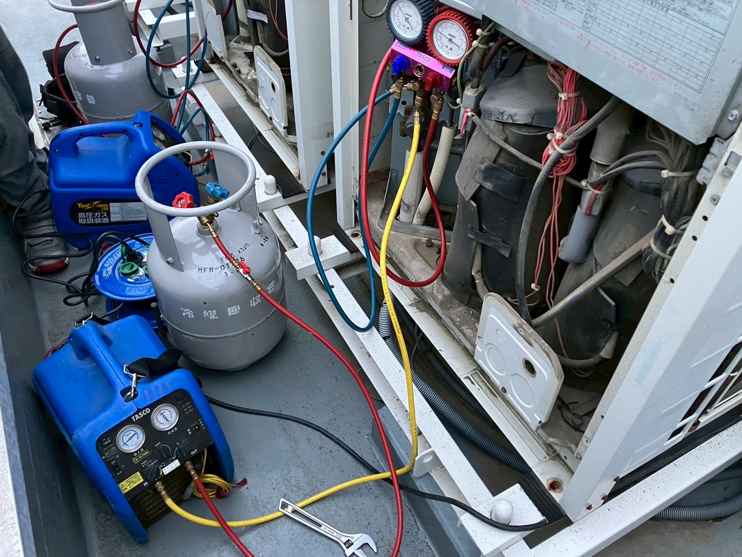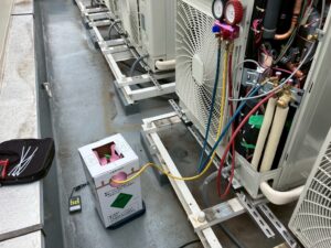 新規機器取付/リモコン交換 弊社では施工後に窒素ガスを使用し耐圧試験を必ず実施しています これは銅管の接続部、溶接個所などから漏れが無いかを確認する試験です 1日現場では短縮法で1時間、複数日工程では1昼夜や24時間確認をしています