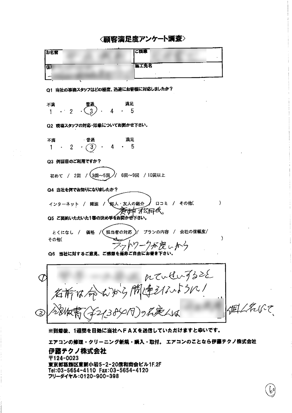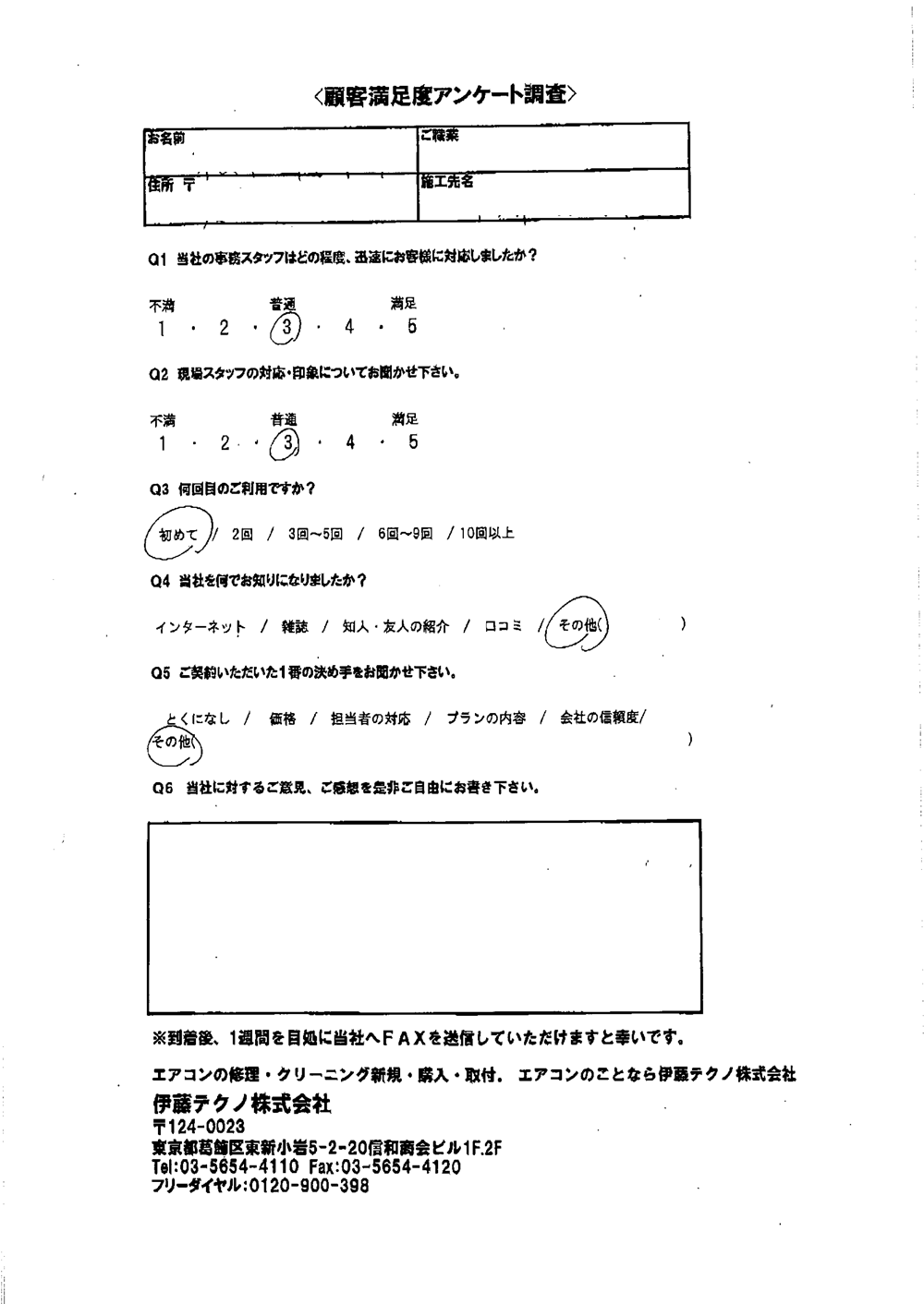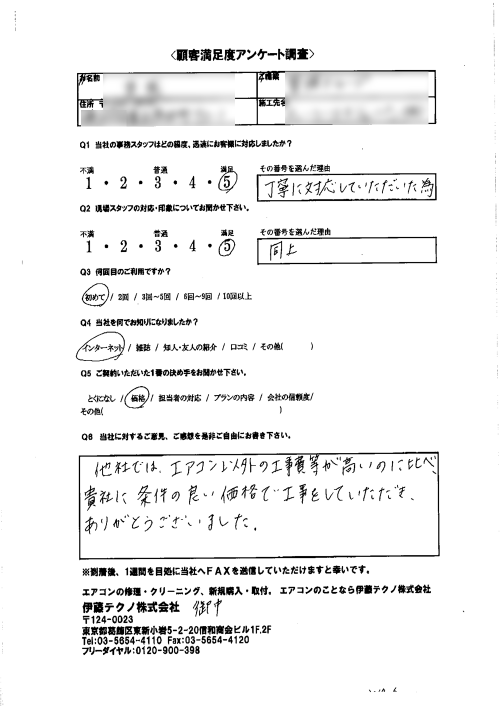 他社ではエアコン以外の工事費等が高いのに比べ、貴社に条件の良い価格で工事をしていただき、ありがとうございました。