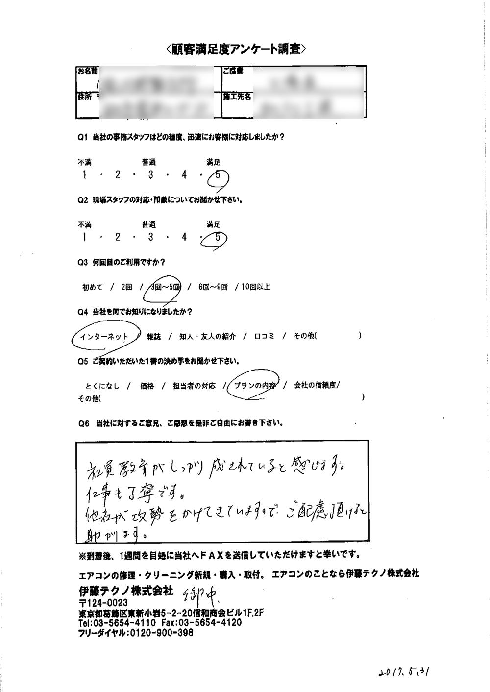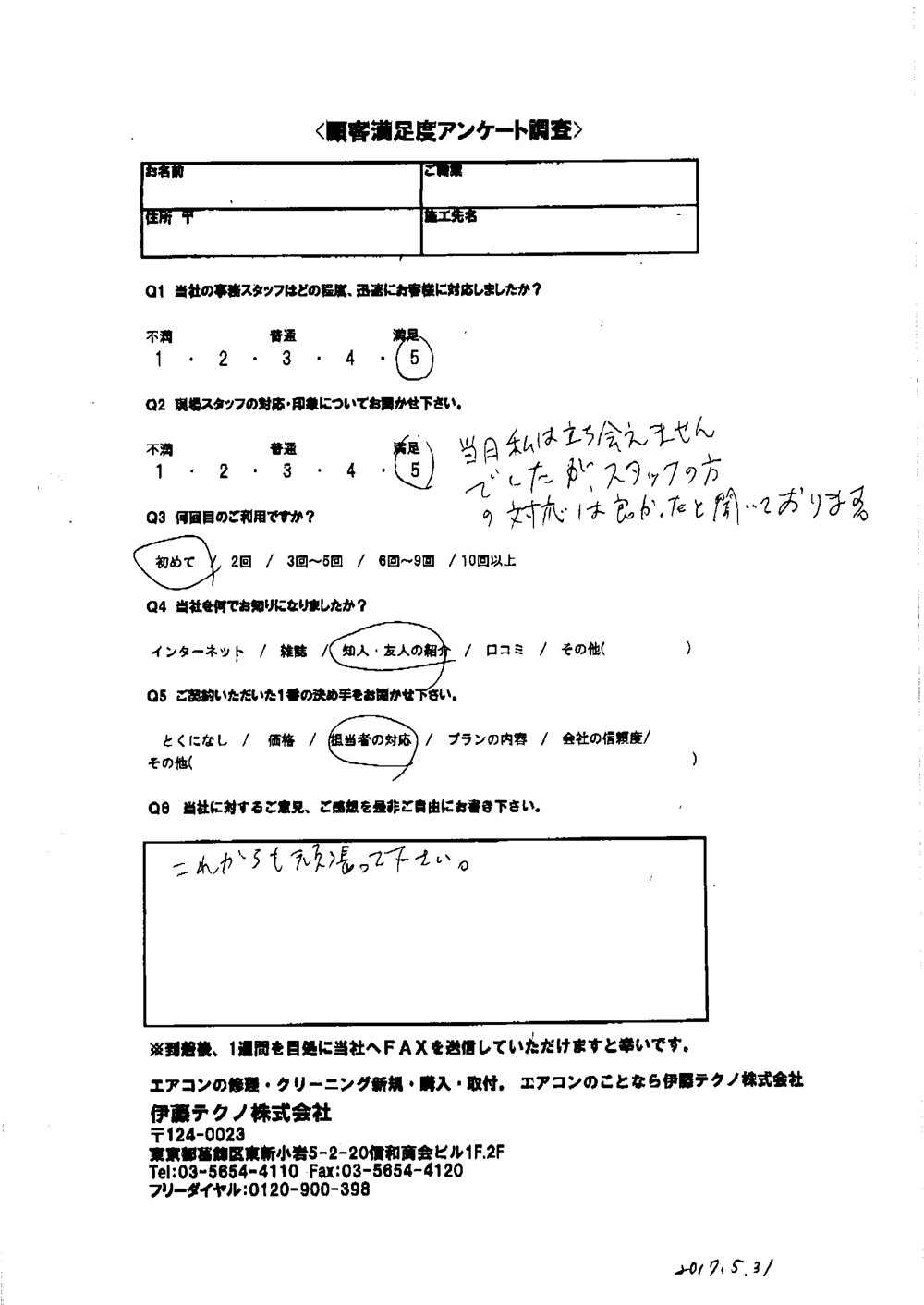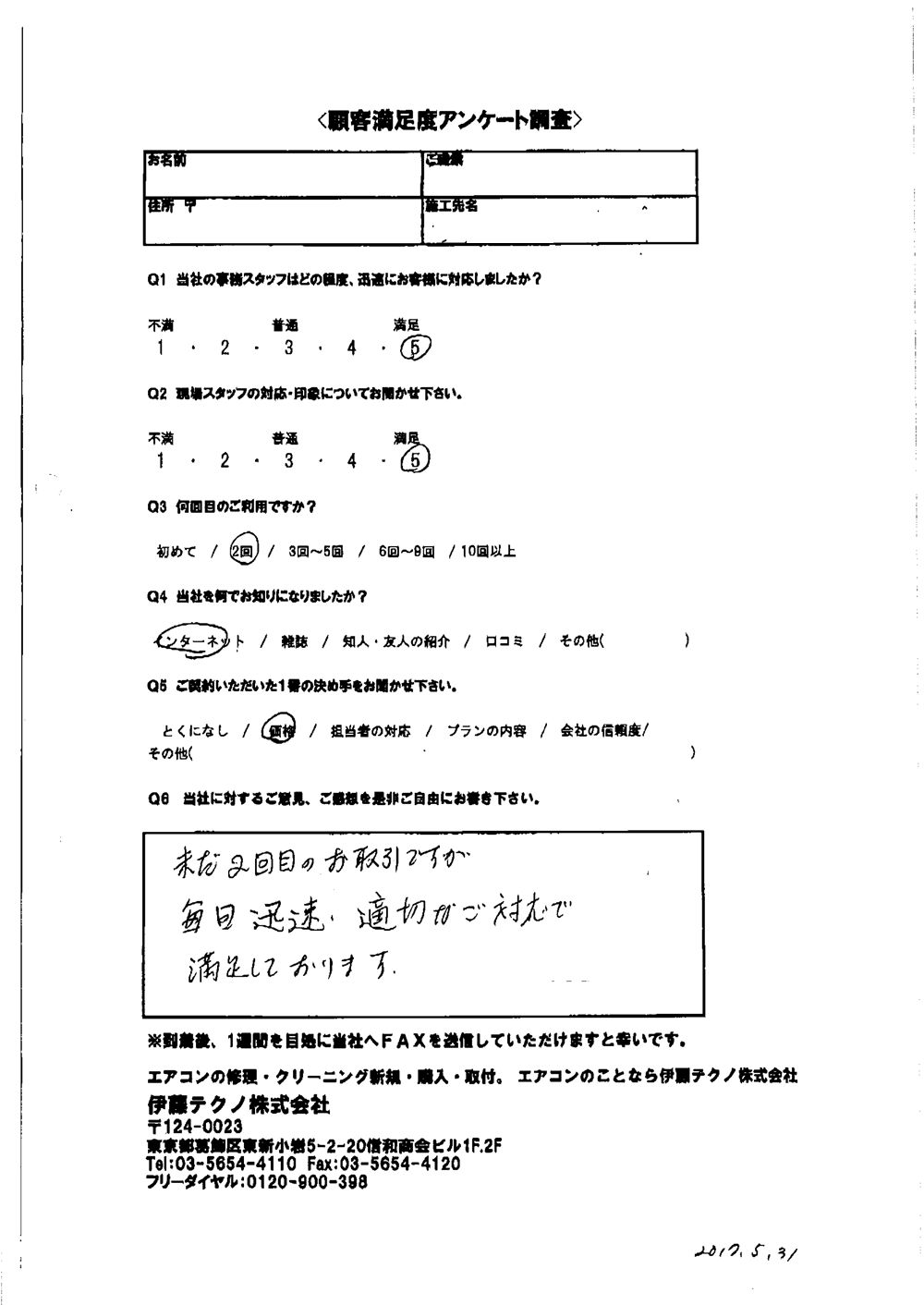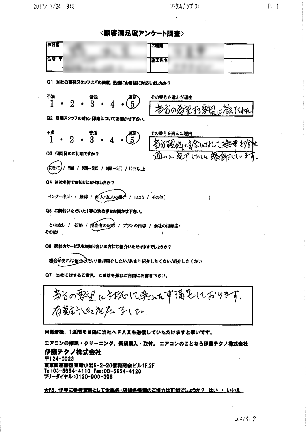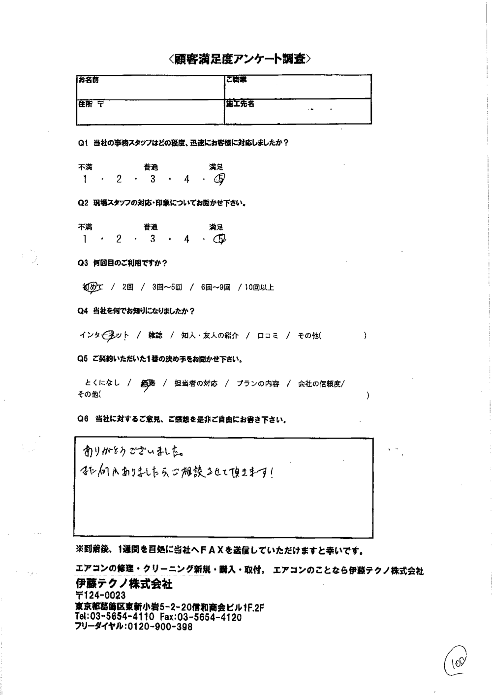 当方現地に立ち合いなしで無事打ち合わせ通りに完了したこと感謝しています。当方の要望に対応してくれたこと満足しております。ありがとうございました。