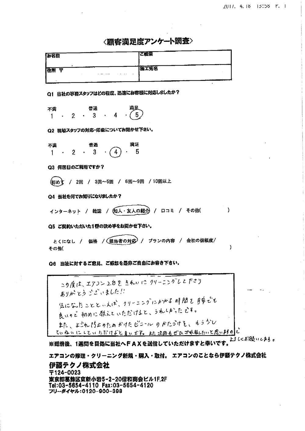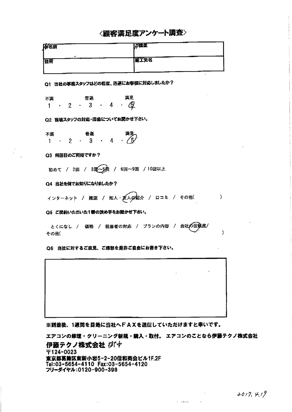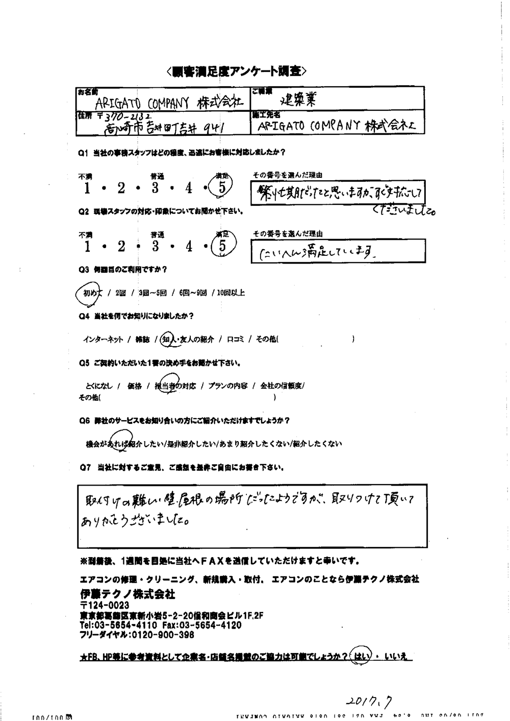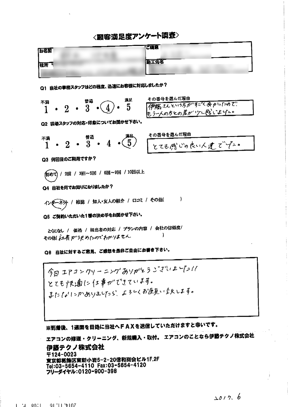 当方現地に立ち合いなしで無事打ち合わせ通りに完了したこと感謝しています。当方の要望に対応してくれたこと満足しております。ありがとうございました。