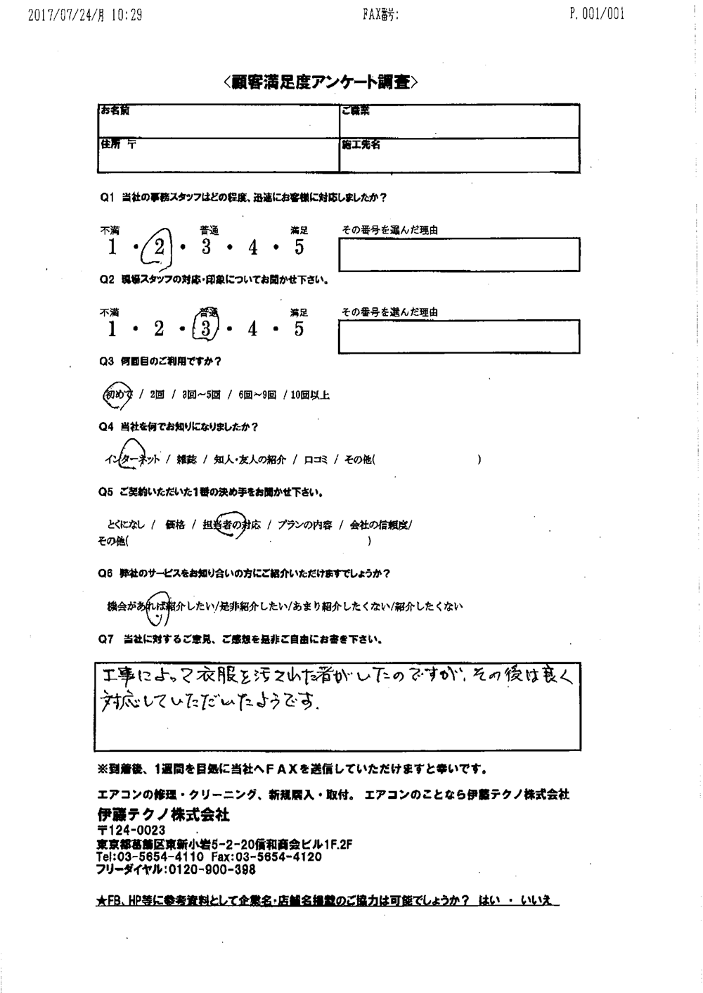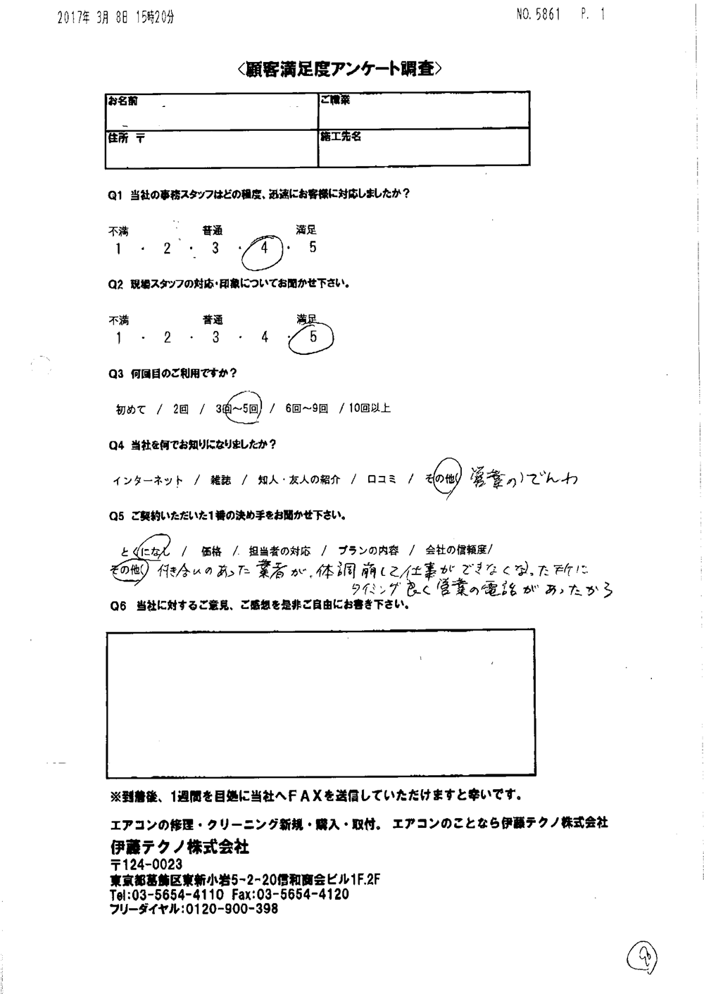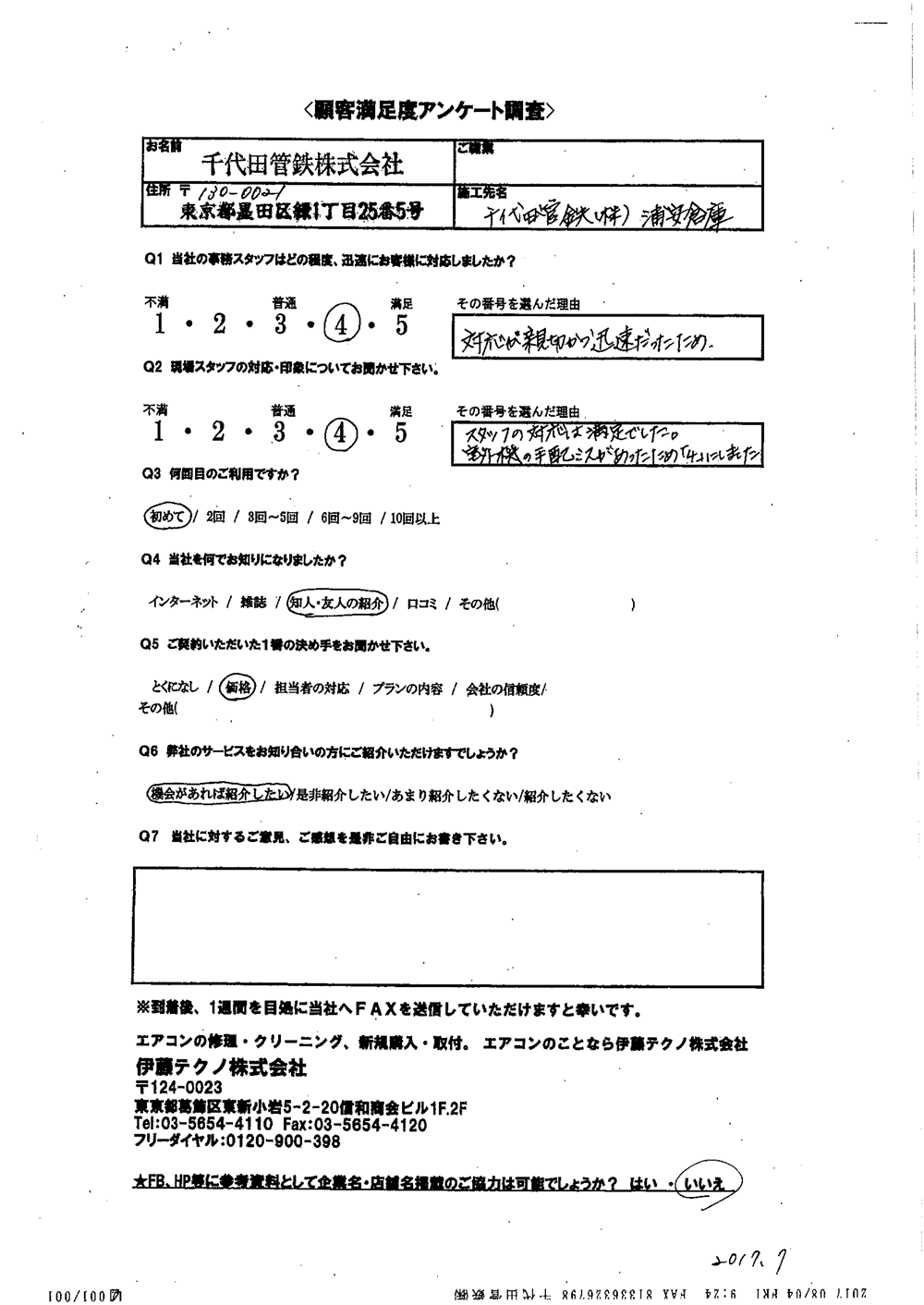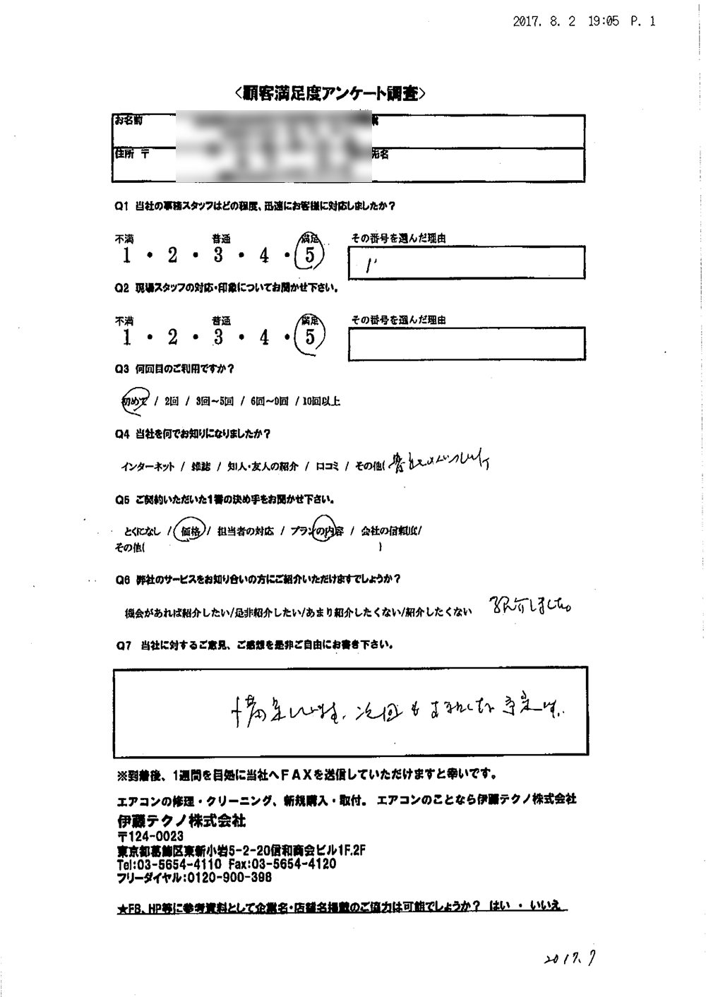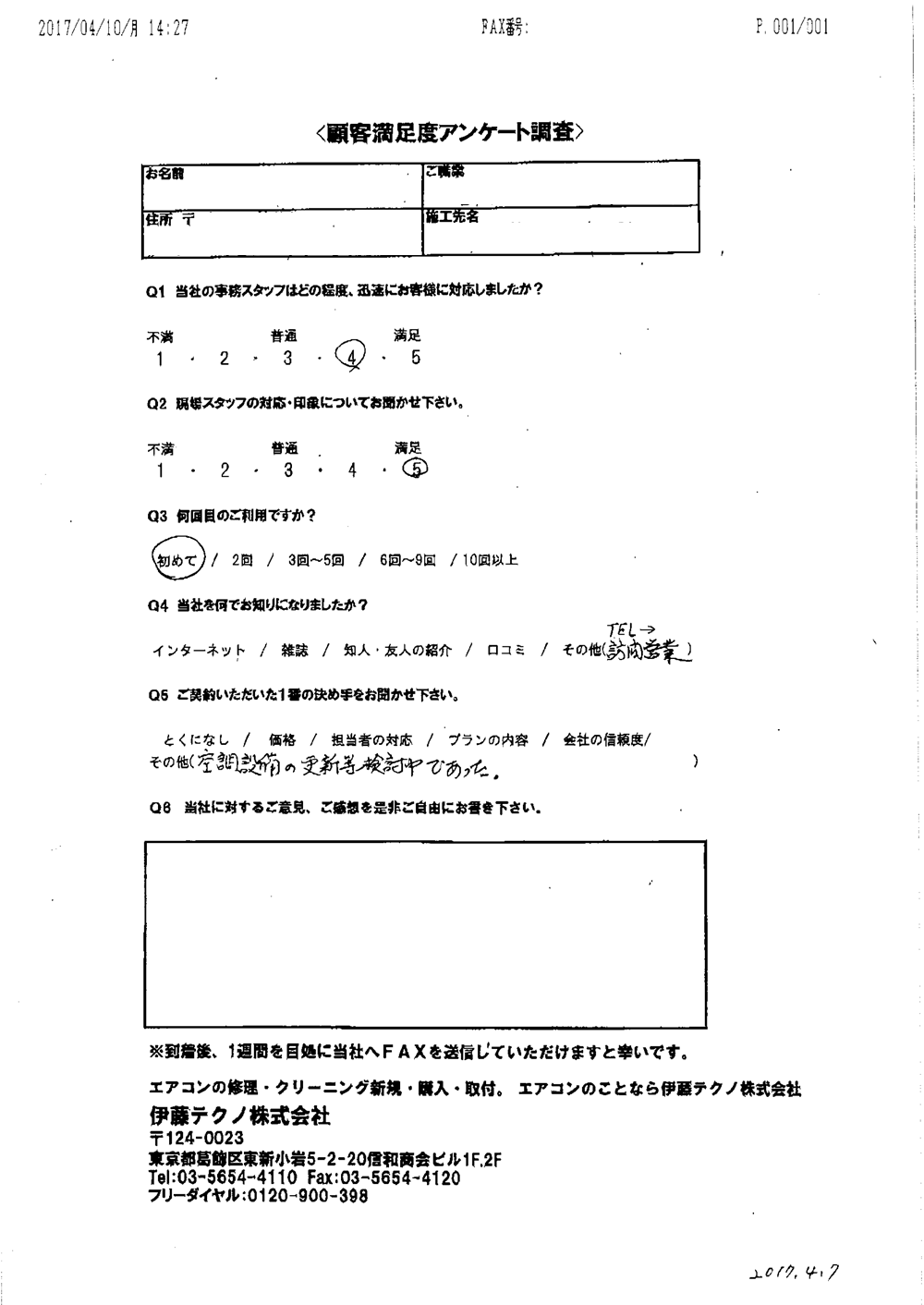 当方現地に立ち合いなしで無事打ち合わせ通りに完了したこと感謝しています。当方の要望に対応してくれたこと満足しております。ありがとうございました。